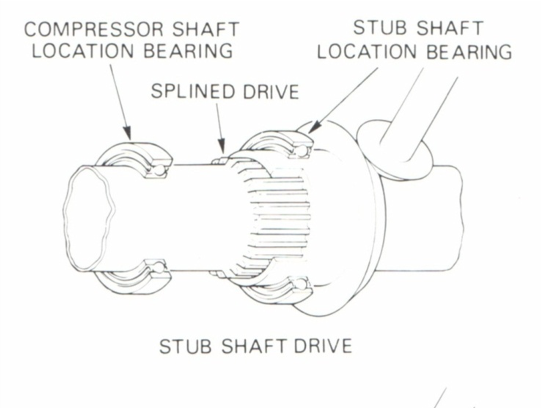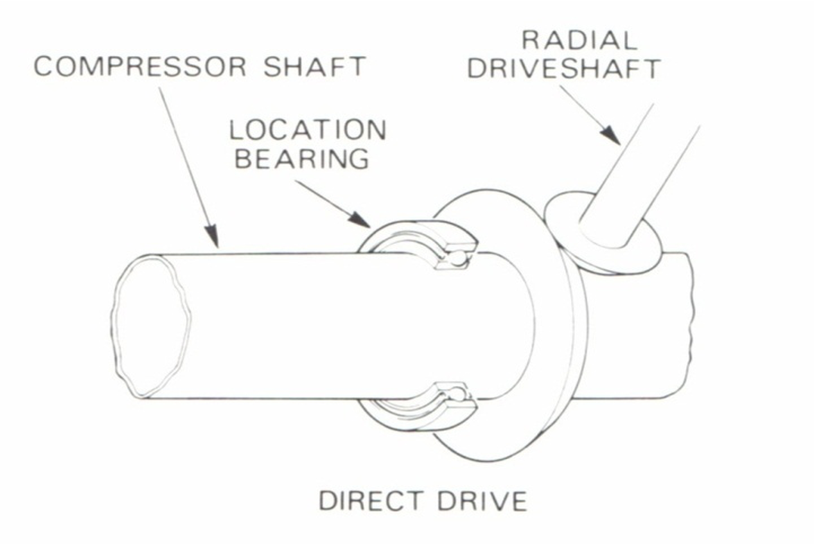 This arrangement requires meshing bevel gears accommodate for SMALL AXIAL movements of compressor shaft.