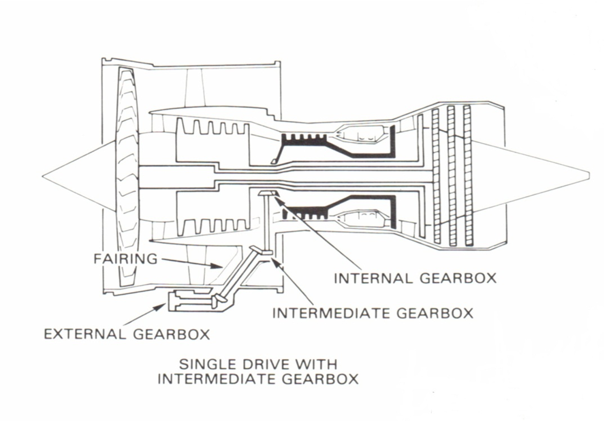 an intermediate or transfer gearbox is mounted on the high pressure compressor case and re-directs the drive, through the use of bevel gears, to the external gearbox.