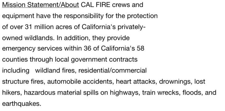 Provides emergency services for wildland fires, structure fires, car accidents, drawings, lost hikers, floods, earthquakes, etc.