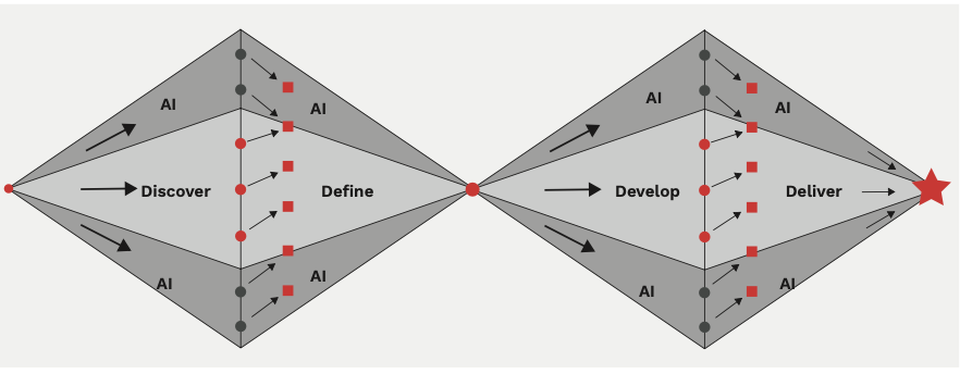 I Double Diamond, metoden kan man bruge AI til at komme bredere ud i modellen. På denne måde, kan man bruge et værktøj som chatgpt til at komme længere ud i mulighedsrummet.