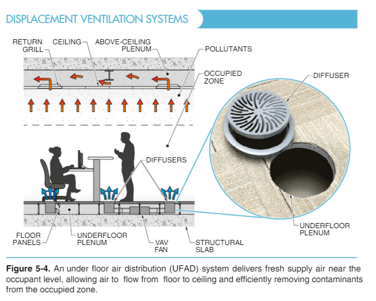 Low-velocity air supplied at a low level to displace warmer air that is then extracted at ceiling level