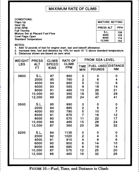 Using the maximum rate of climb, how much fuel would be used from engine start to 6,000 pressure altitude? Aircraft weight 3200, airport pressure altitude 2000ft, temp 27C