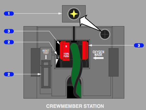 100% oxygen under positive pressure at all cabin altitudes to protect again smoke and harmful vapours