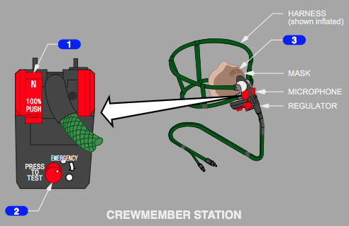 turns oxygen and mask microphone on momentarily to test the regulator