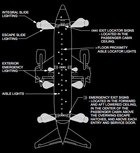 which places around the plane do the interior emergency lights illuminate ?