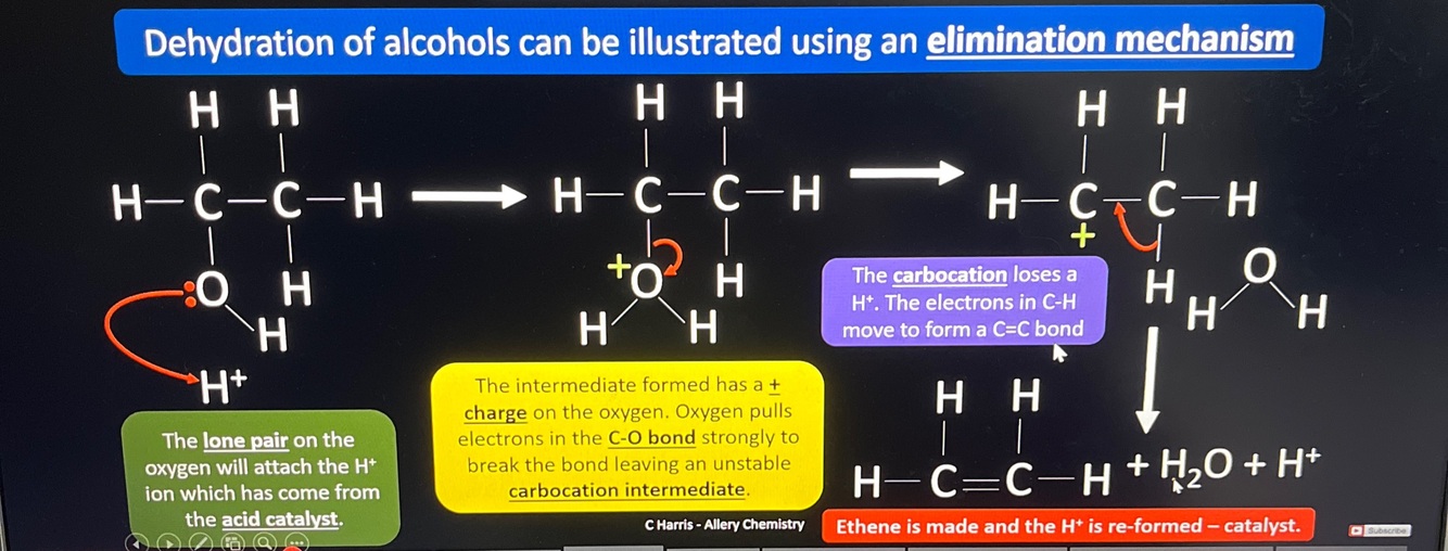 Outline the mechanism for the formation of ethene via the dehydration of ethanol