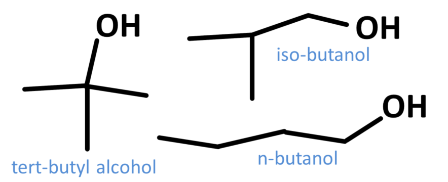 For example, 2-methylbutanol consists of a butane chain with one hydroxyl group bound to its second carbon, which is also attached to a methyl group.
