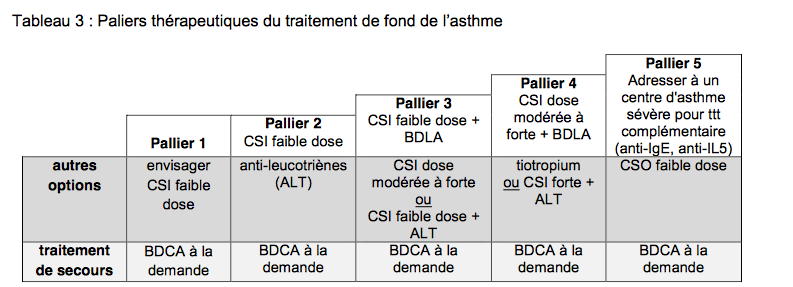 PEC au long cours de l’asthme par palier => 1 à 5 => escalade thérapeutique