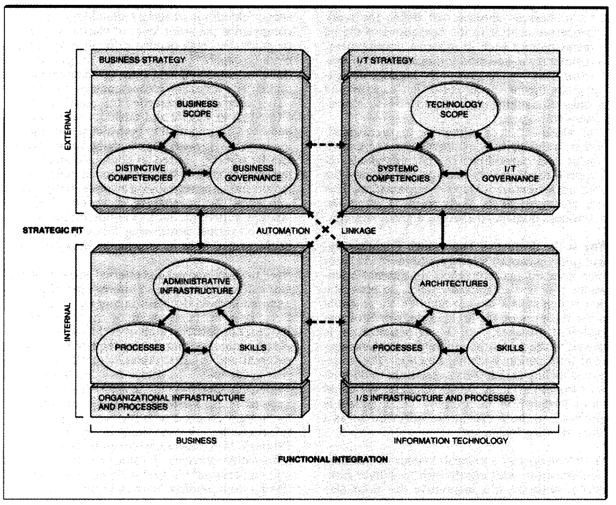 Business Strategy as the Driver: IT can be used to execute existing strategy (Strategy execution) or transform (Technology Transformation) the business through strategic use of IT.