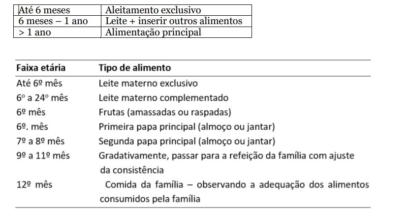 < 6 meses deve receber APENAS o aleitamento = amamentação exclusiva NÃO pode dar: água, chá, suco, outros leites, outros alimentos (nem papinha, nem mingau).