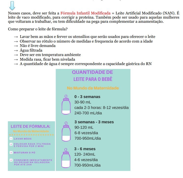 A mãe que vai trabalhar, tambem pode guardar o leite e conservar na geladeira. E a pessoa que for cuidar e oferecer esse leite para a criança, deve dar em copo, xicara ou colher. Crianças em usa de fórmula infantil, após os 6 meses devem ser introduzidos outros alimentos e a partir dos 9 meses pode substituir a formula por leite integral.
