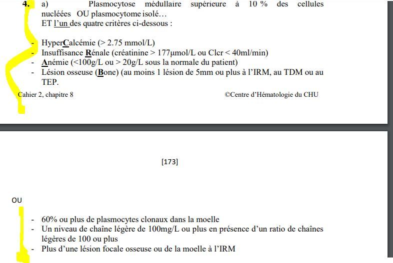 Plus d’une lésion lytique à l’irm avec > 100 g/l de chaine legere avec 60 % ou plus de plasmocyte clonaux dans la moelle