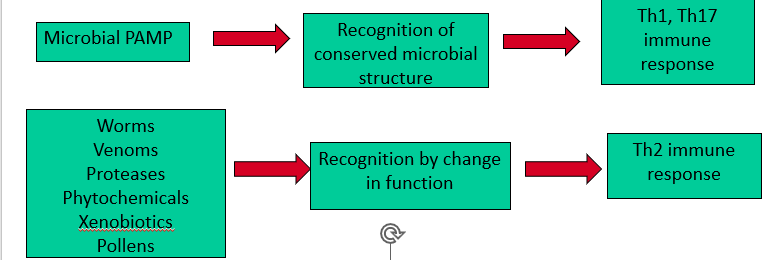 for worms, venoms and allergens (proteases, phytochemicals, xenobiotics and pollen the immune system recognises loss in tissue func ie disruption of epithelial barrier - type 2 immune response