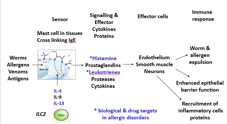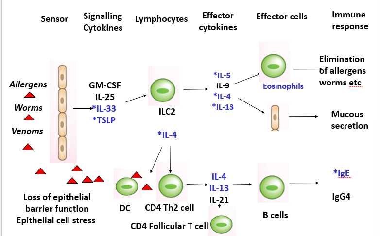 Stressed or damaged epithelial cells secrete IL-25, IL-33, GM-CSF and TSLP which act on tissue immune cells (DC, basophils, type 2 innate lymphoid cells) to induce Th2 cells immune responses (IL-4, IL-5, IL-9, IL-13) and sensory neurons (itch/sneeze)