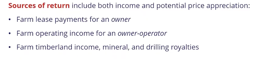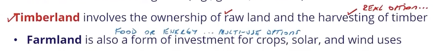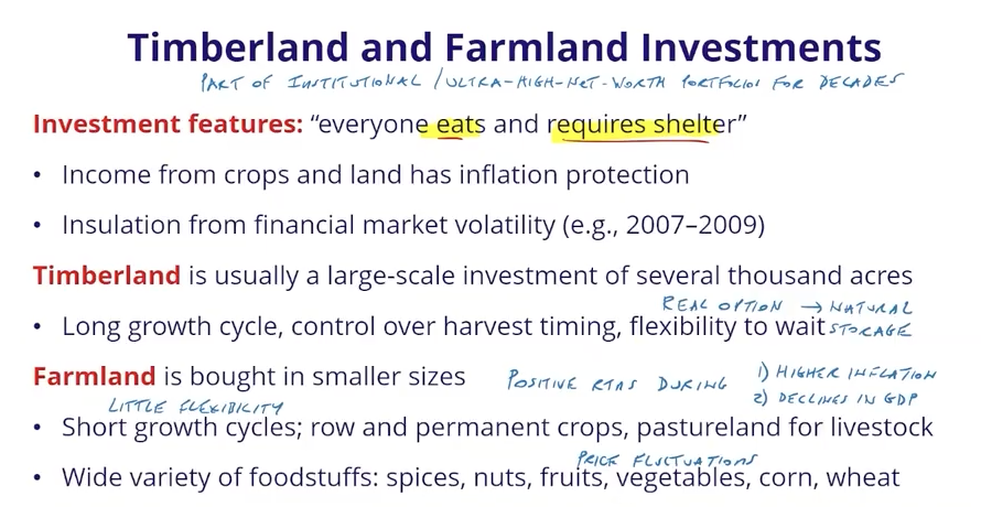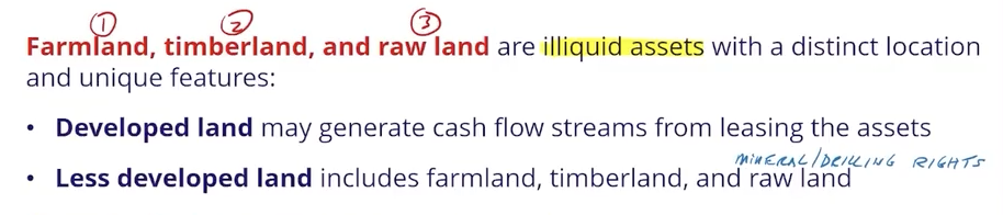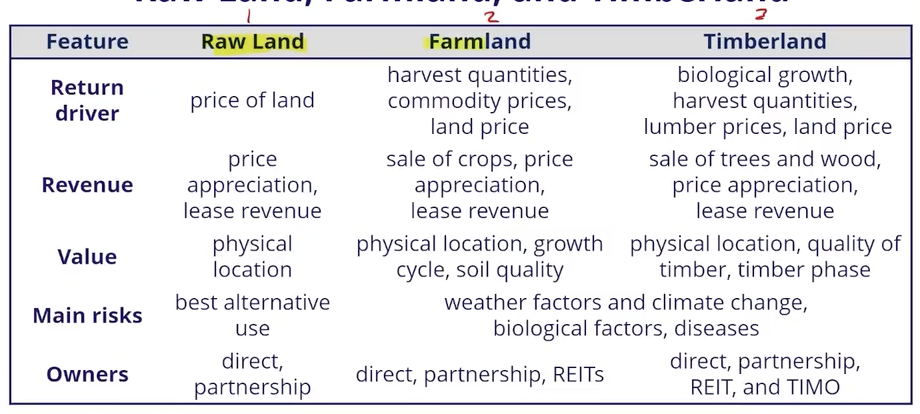 80.1 TABLE: raw land, farmland, and timberland and their features: Return driver, revenue, value, main risks, owners!