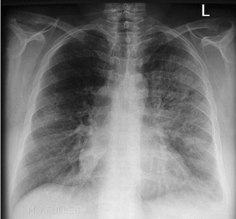 tuberculosis ( in the past also called phthisis, phthisis pulmonalis, or consumption, is a widespread, infectious disease caused by various strains of mycobacteria, usually Mycobacterium tuberculosis.[1] Tuberculosis generally affects the lungs, but can also affect other parts of the body. It is spread through the air when people who have an active TB infection cough, sneeze, or otherwise transmit respiratory fluids through the air)–fungal lung infection (especially in immunocompromised patients)–incompletely treated infection