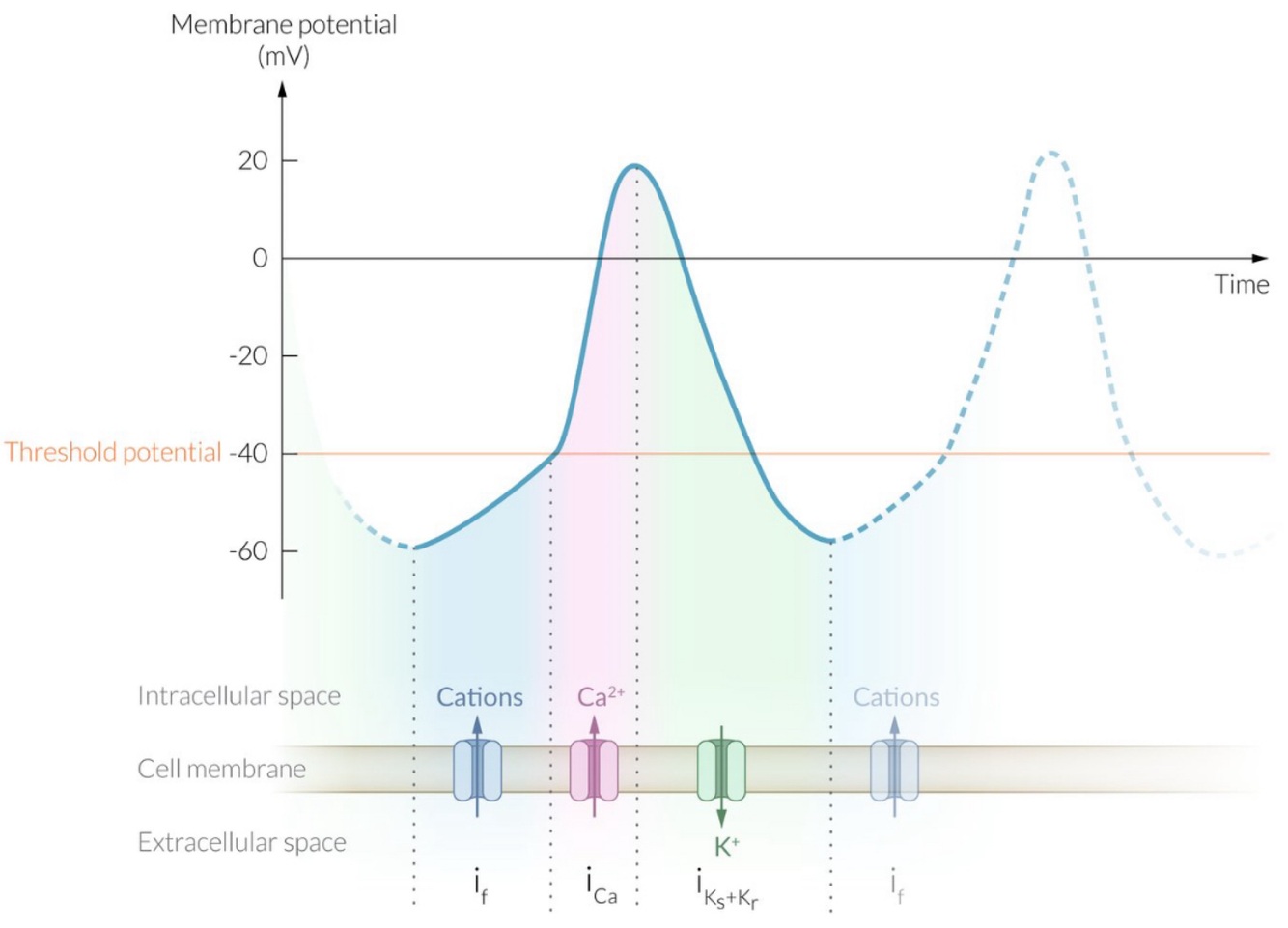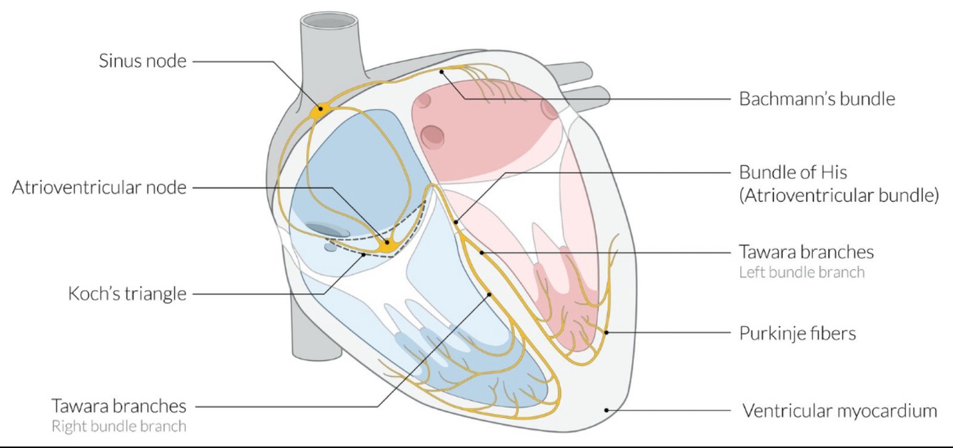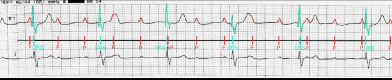 En el bloqueo cardíaco completo, los impulsos eléctricos del nodo SA no se conducen a los ventrículos. Los miocitos de la vía de conducción cardíaca tienen el potencial de despolarizar espontáneamente y comportarse como marcapasos cuando no reciben señales del nodo SA, lo que resulta en ritmos de escape. Dependiendo de la forma de los complejos QRS de los ritmos de escape, se puede determinar el sitio de estos marcapasos ectópicos. Los complejos QRS normales y estrechos como se ve en este ECG son desencadenados por impulsos en cualquier lugar desde el nodo SA hasta el haz de His (es decir, el bloque está en o proximal al haz de His).