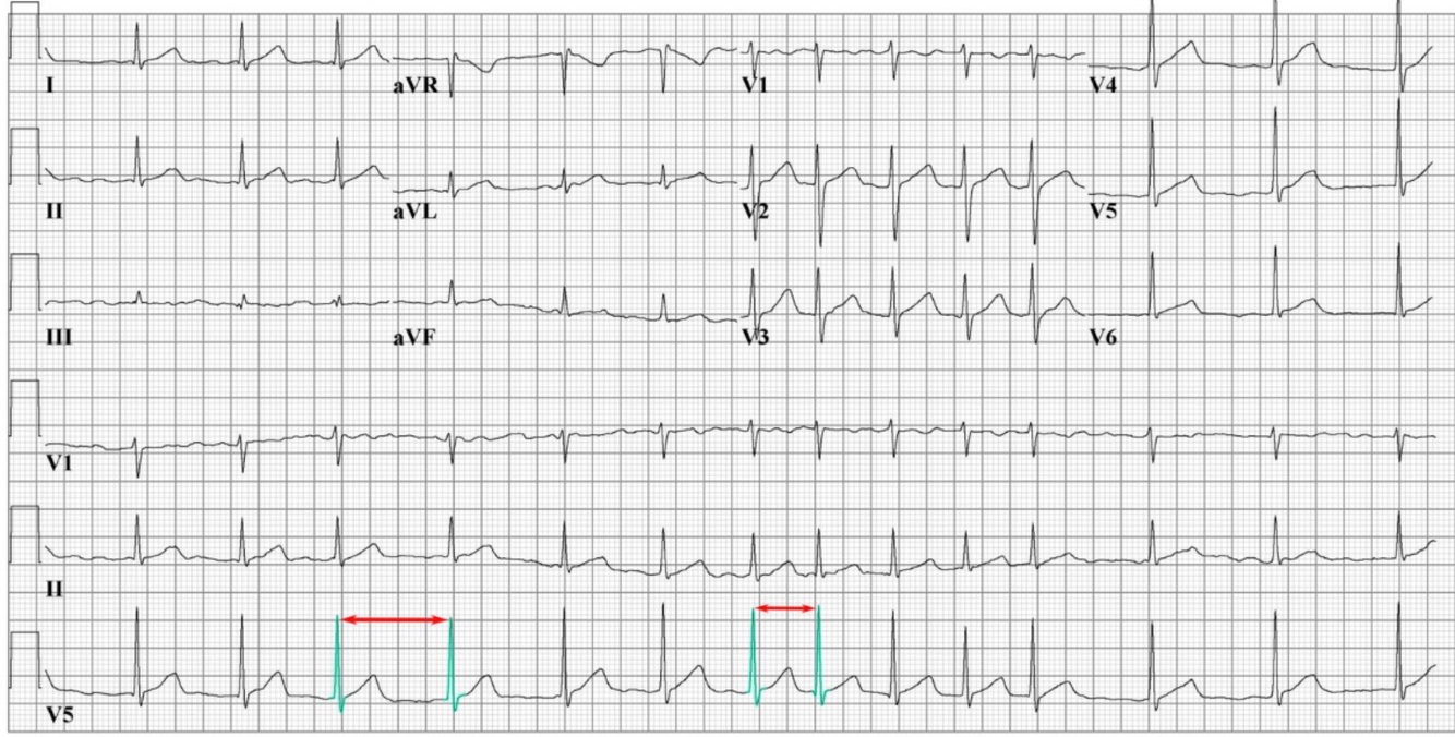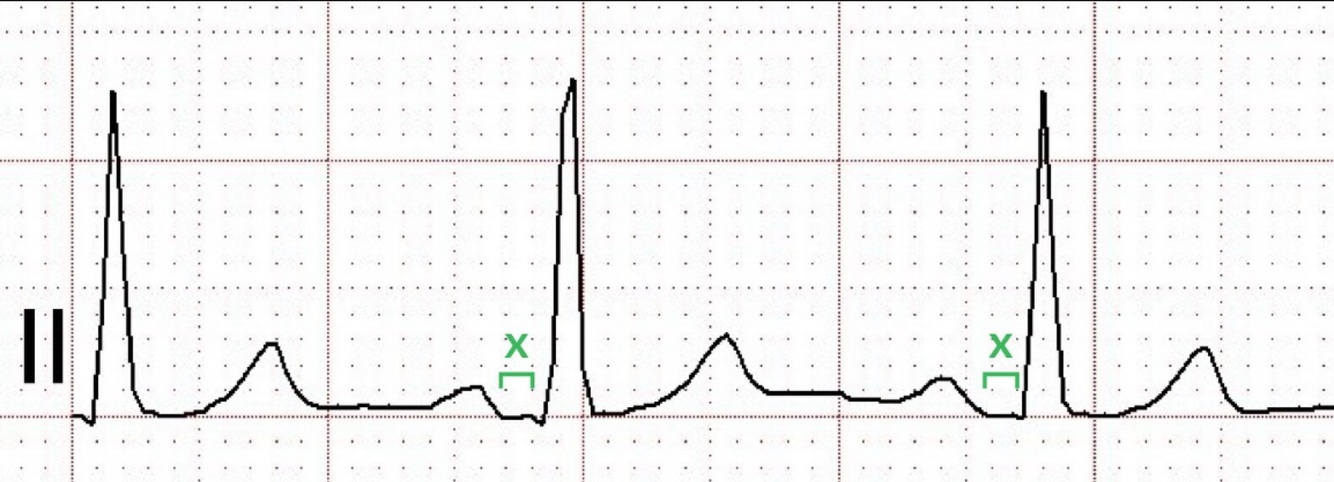 La disnea de este paciente, los mareos, los episodios sincópicos (ataques de Stokes-Adams), la bradicardia, el infarto de miocardio inferior (IM) reciente y los hallazgos del ECG son consistentes con un bloqueo auriculoventricular de tercer grado (es decir, bloqueo AV completo). Esta condición se caracteriza por la disociación AV, en la que las aurículas (ondas P) y los ventrículos (complemples QRS) laten independientemente entre sí. Los bloqueos AV de tercer grado ocurren debido a la conducción deteriorada a nivel del nodo AV (~ 20%), haz de His, o por debajo del haz His (más común; ~ 60%). Un bloque por encima del haz His está asociado con complejos QRS estrechos (< 120 ms), mientras que un bloque debajo del haz His se caracteriza por complejos QRS anchos. Además, la frecuencia auricular es mayor que la frecuencia ventricular (es decir, más ondas P que complejos QRS) y tanto las frecuencias auricular como ventricular son constantes.