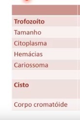 Núcleo pequeno central, com cromatina em forma de roda carroça, ou seja uma parte da cromatina mais central e outra mais periférica. Além disso, percebe-se uma porção do citoplasma mais densa e , portanto, mais corada, o endoplasma. Em contraste, o restante do citoplasma é o ectoplasma. Os pseudópodes podem apresentar diversas conformações, conferindo um aspecto pleomórfico ao trofozóito desse parasito.