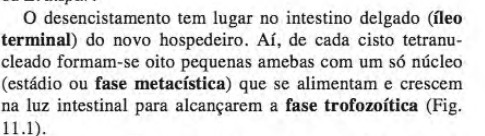 Aonde exatamente ocorre o desencistamento da E. hystolitica no intestino delgado, quantos trofozoítos são gerados