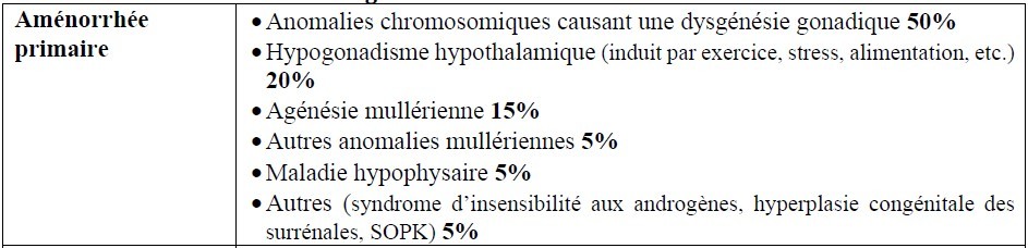 Donner 6 étiologies possibles d’amenorrhée primaire et les classer par ordre de fréquence