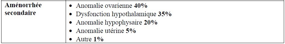 Donner les 5 groupes étiologiques possibles d’amenorrhée secondaire et les classer par fréquence