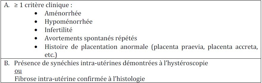poser le diagnostic de syndrome d’Asherman, il faut que A et B soient présents :