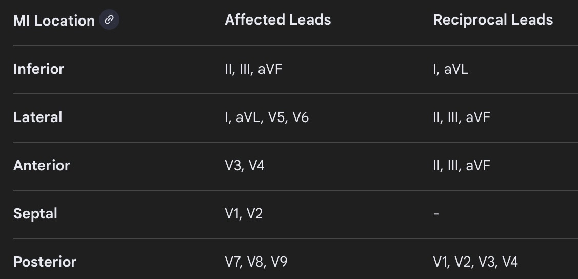 “high lateral” MIs with STE in I and aVL –> can show reciprocal ST segment depression in leads II, III and aVF.