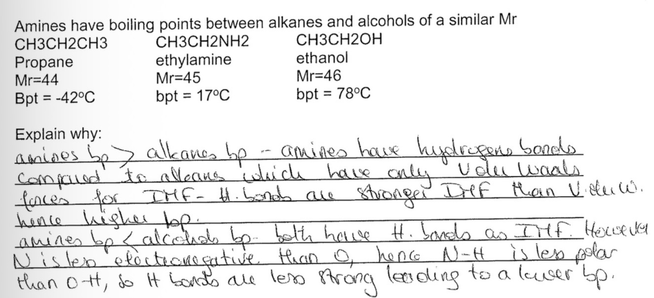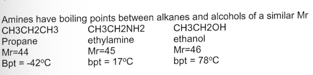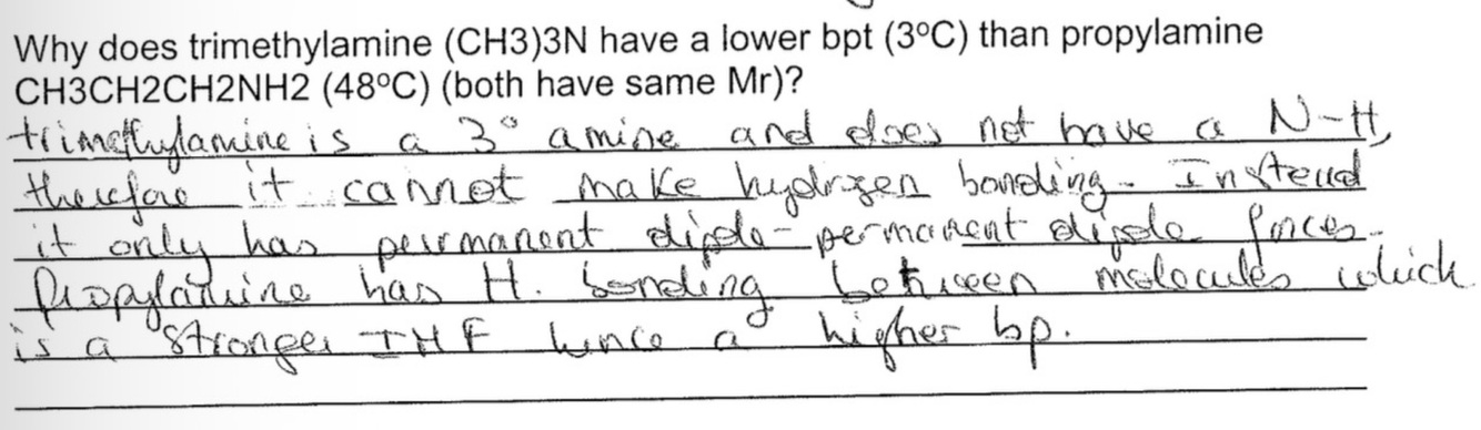 Why does trimethylamine (CH3)3N have a lower bpt (3°C) than propylamine CH3CH2CH2NH2 (48°C) (both have same Mr)?