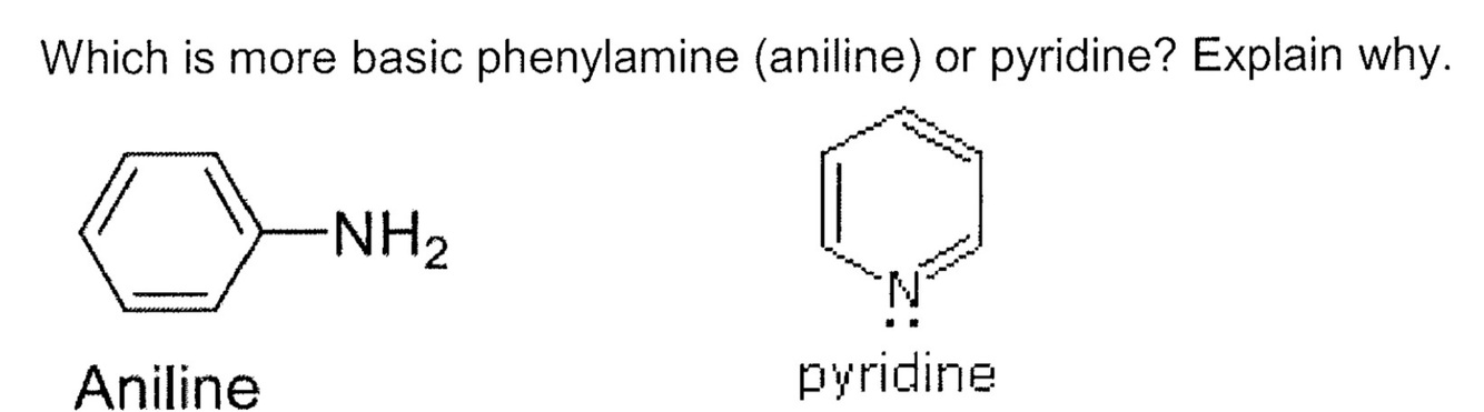 In phenylamine the lone pair of electrons is involved in the delocalised ring system but in pyridine the lone pair isn’t involved in the delocalised ring system and hence is more electron dense and more basic than phenylamine