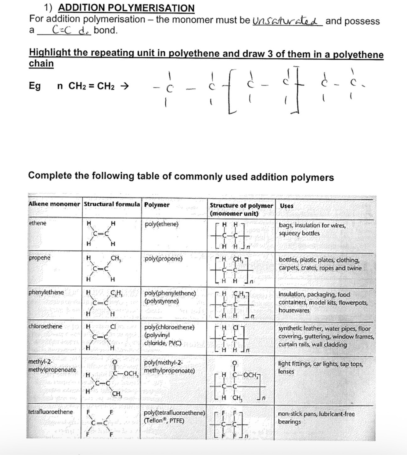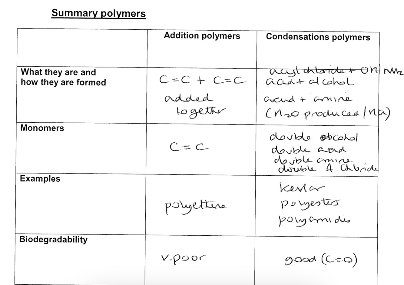 Summary of addition / condensation polymerisation