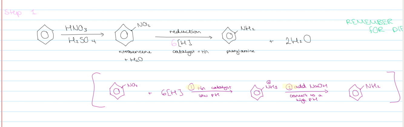 how to turn nitrobenzene into a phenyl amine (and water)
