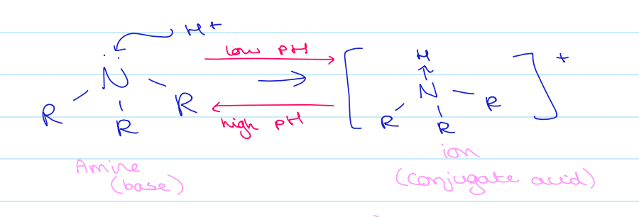 how the reaction that occurs when amines are put in low and high pH