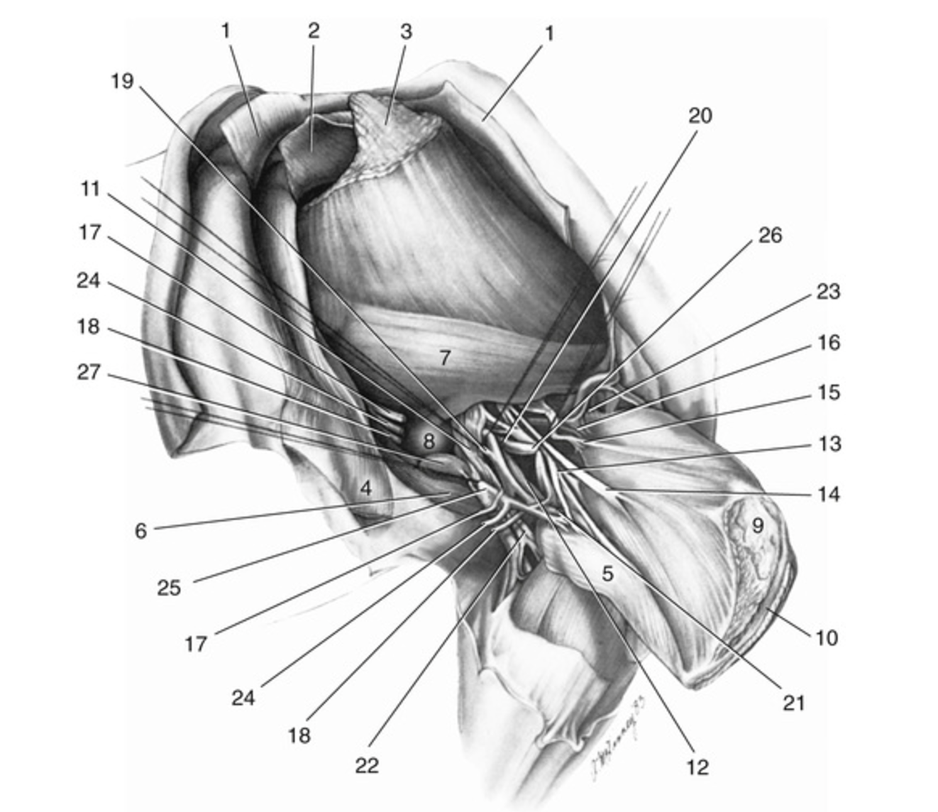 The superficial circumflex iliac artery and vein and the lateral circumflex femoral artery and vein.