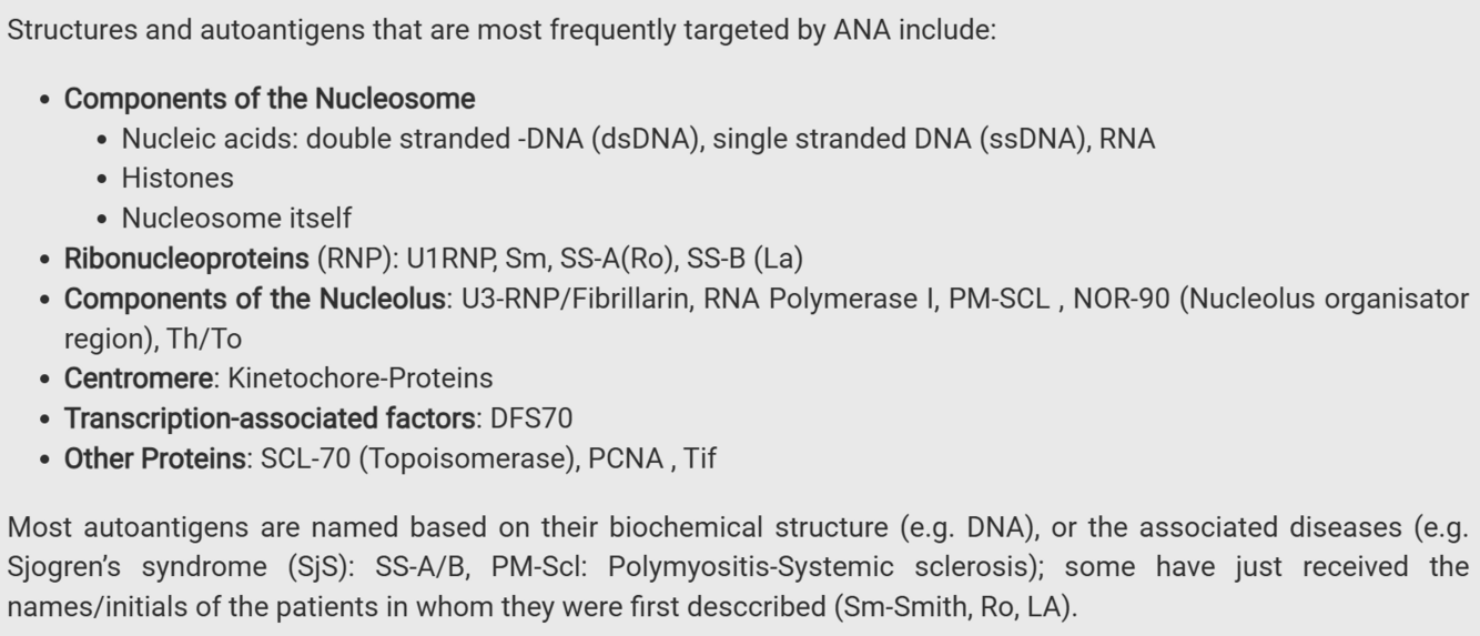 What structures and autoantigens are most frequently targeted by ANA (antibodies to nuclear antigens)?
