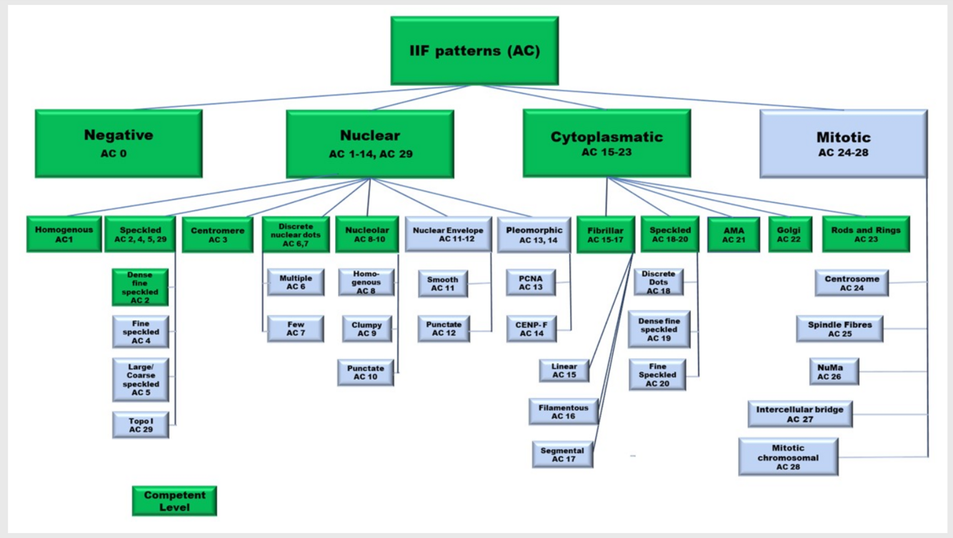 ICAP - International Consensus on ANA Patterns (https://www.anapatterns.org/index.php) - 29 different ANA patterns (classified into 3 groups - nuclear, cytoplasmic and mitotic). Each pattern and sub-pattern is assigned an anti-cell (AC) pattern from AC-1 to AC-29.
