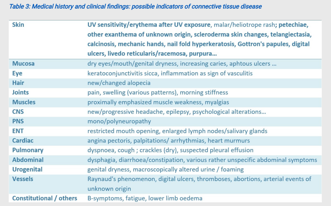 What clues on a general ‘systems review’ might indicate possible CTD and be of significance in the context of a positive ANA?