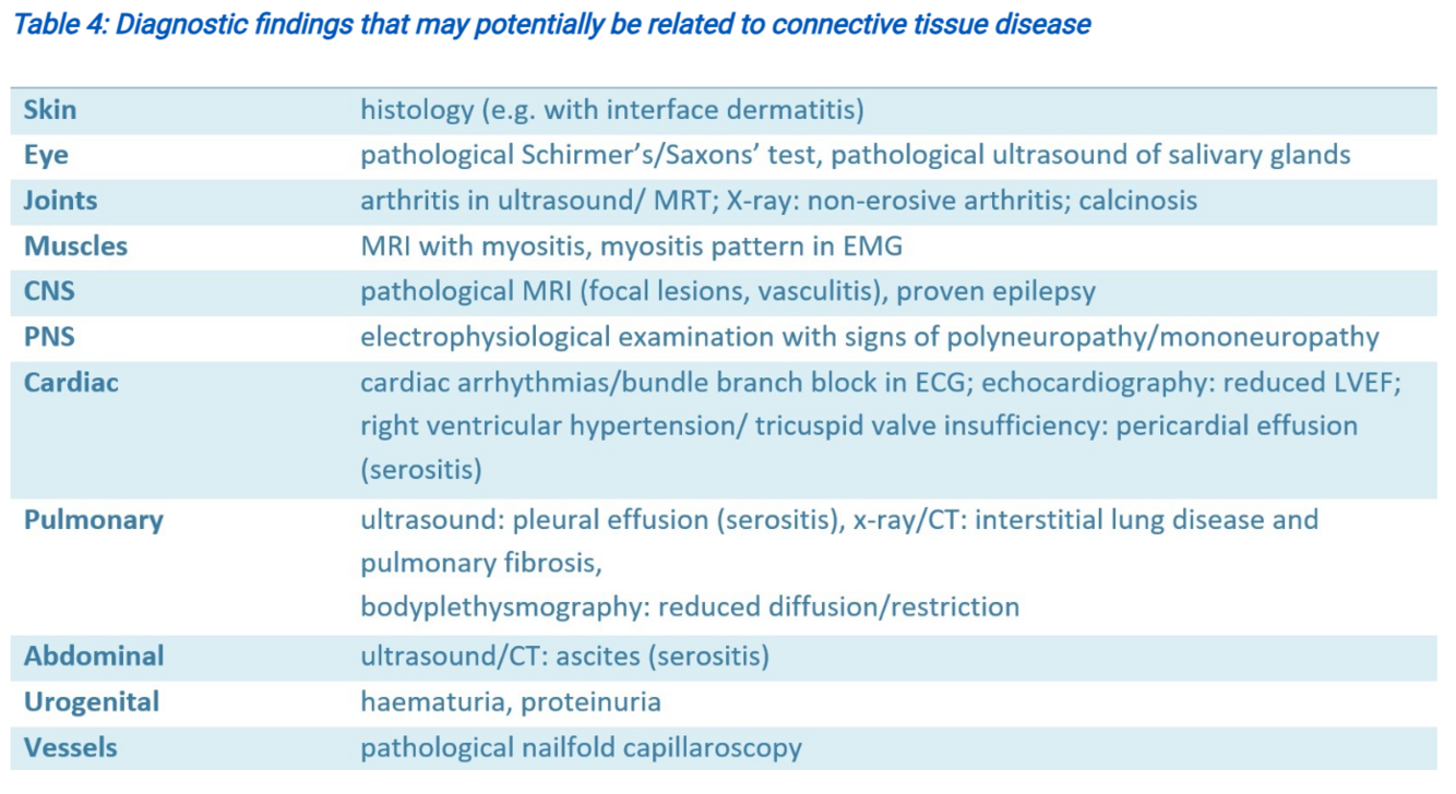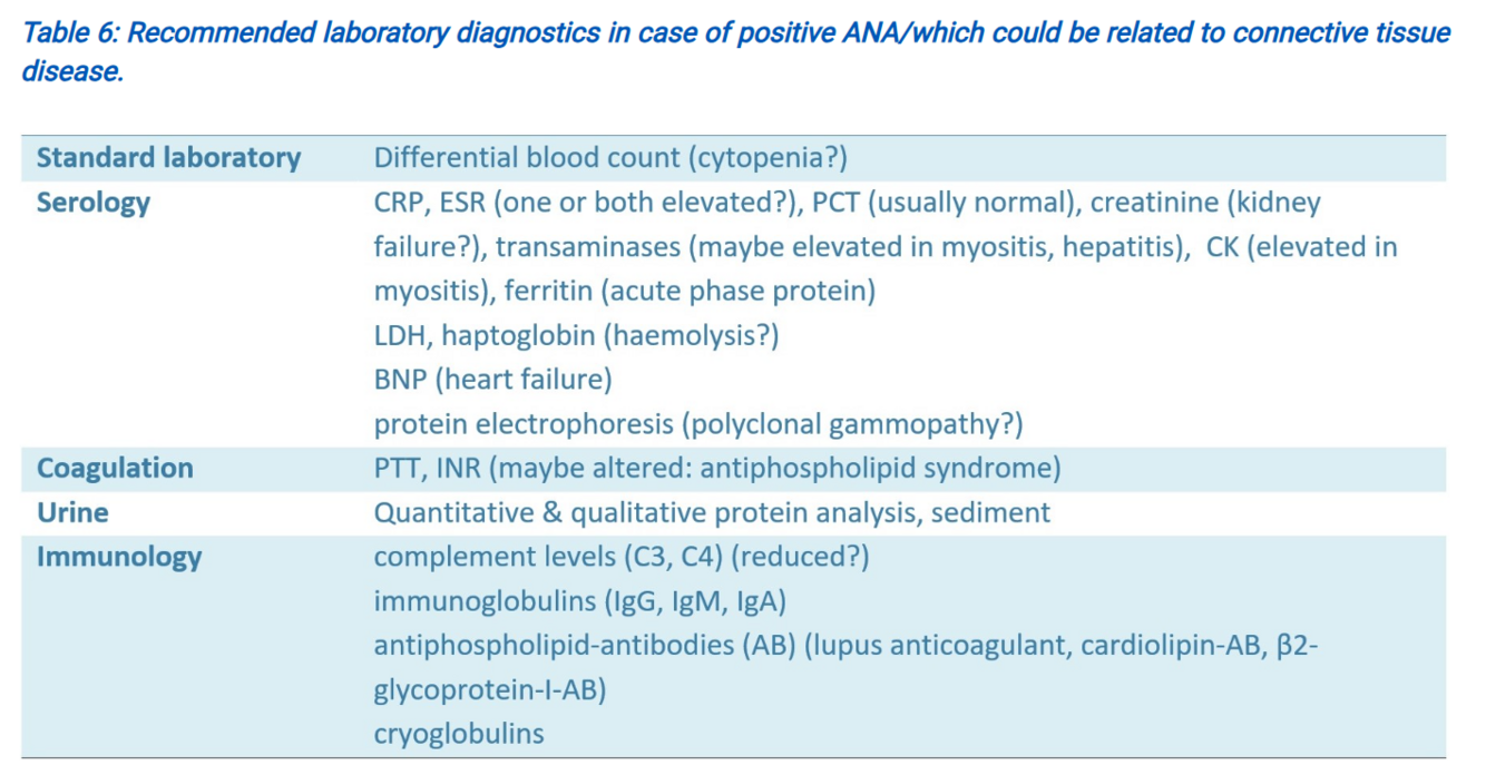 What are some recommended laboratory diagnostics in case of positive ANA/which could be related to connective tissue disease?