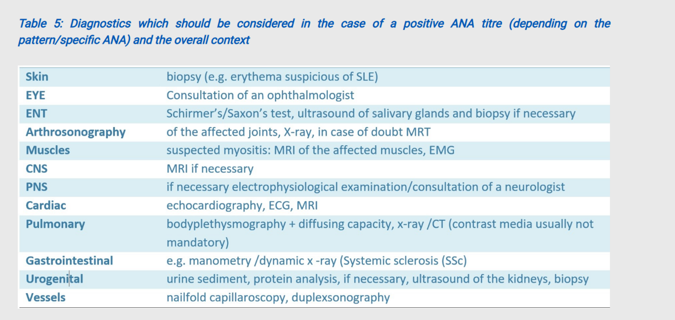 What diagnostics should be considered in the case of a positive ANA titre (depending on the pattern/specific ANA) and the overall context?