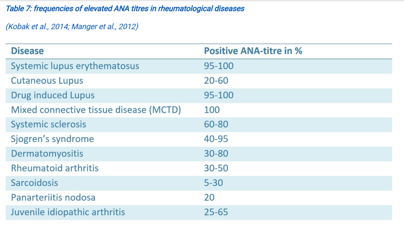 On the other hand, in about 3 % of the population, ANA titres of 1:320 can be detected, or even more than 10% have a titre of 1:80. Both findings together make it clear: The probability that a person with a positive ANA titre suffers from lupus is very low. The vast majority of individuals with positive ANA titres is not affected by any rheumatological diseases.