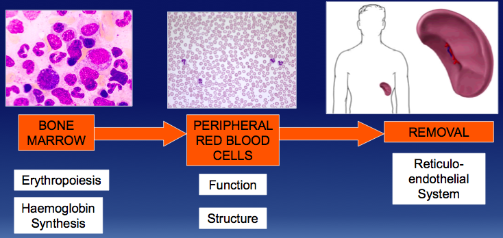 The spleen removes damaged or defective red cells in a variety of causes of amaemia (membrane, enzyme and Hb disorders). In haemolytic anaemia, red cells are destroyed more quickly as they are abnormal or damaged.