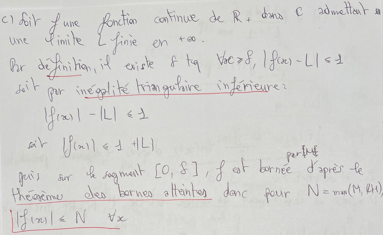Établir qu’une fonction continue de ℝ⁺ dans ℂ ayant une limite finie L en +∞ est bornée sur ℝ⁺