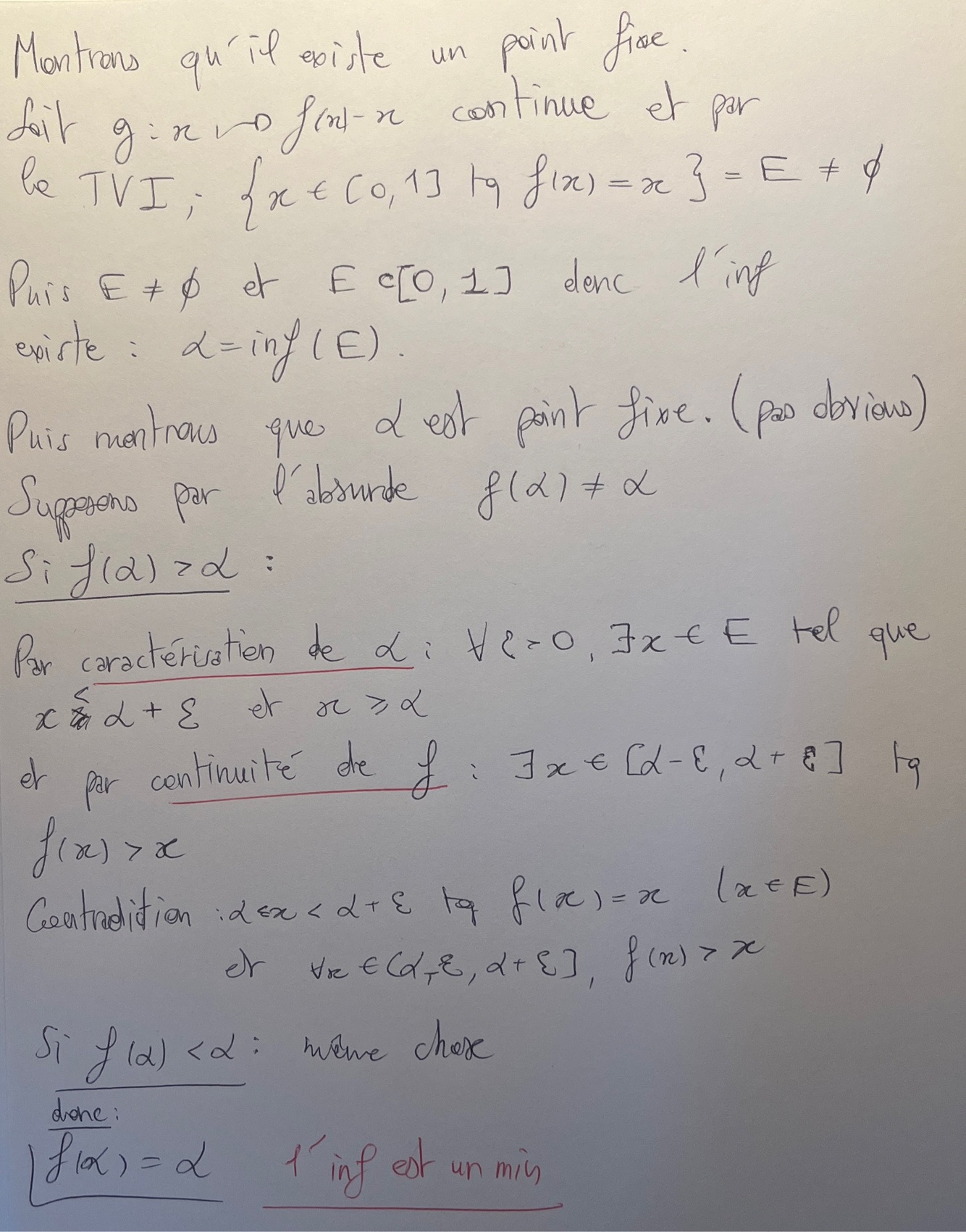 Soit f : [0,1] → [0,1] continue. Montrer que f admet un plus petit point fixe