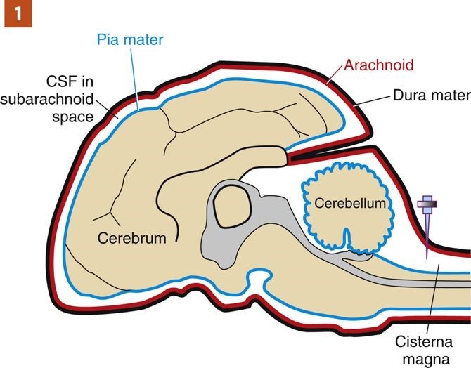 In dogs and cats the most reliable source of uncontaminated CSF for analysis is the cerebellomedullary cistern (cisterna magna). Although it is often stated that cisternal CSF best reflects intracranial disease and lumbar CSF reflects spinal cord disease, diagnostically samples from the two sites are not very different.