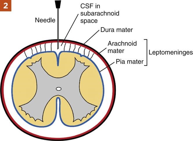 4. If dark venous blood appears in the spinal needle, the needle should be withdrawn and the procedure repeated with another sterile needle. It is most likely that venous structures lateral to midline and external to the dura mater were punctured, so the CSF should be uncontaminated.