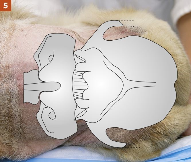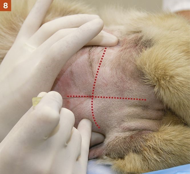 1. The examiner can then use the left index finger to palpate the external occipital protuberance and draw a second imaginary line caudally from that site along the dorsal midline. The needle is inserted where the two imaginary lines intersect.