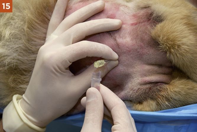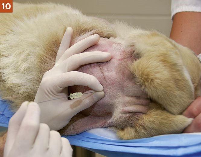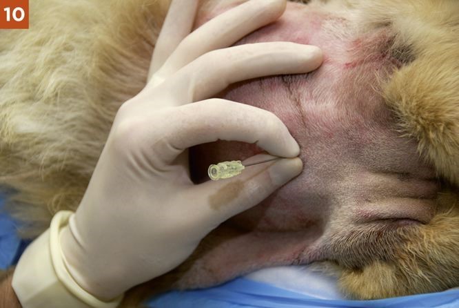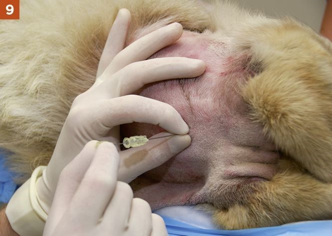 2. A “pop” may be felt as the dorsal atlantooccipital membrane and the dura mater and arachnoid mater are penetrated. This is not a reliable sign, however, and the level at which the subarachnoid space is reached varies greatly with the breed and individual animal. It is often very close to the skin surface in toy breeds and some cats.