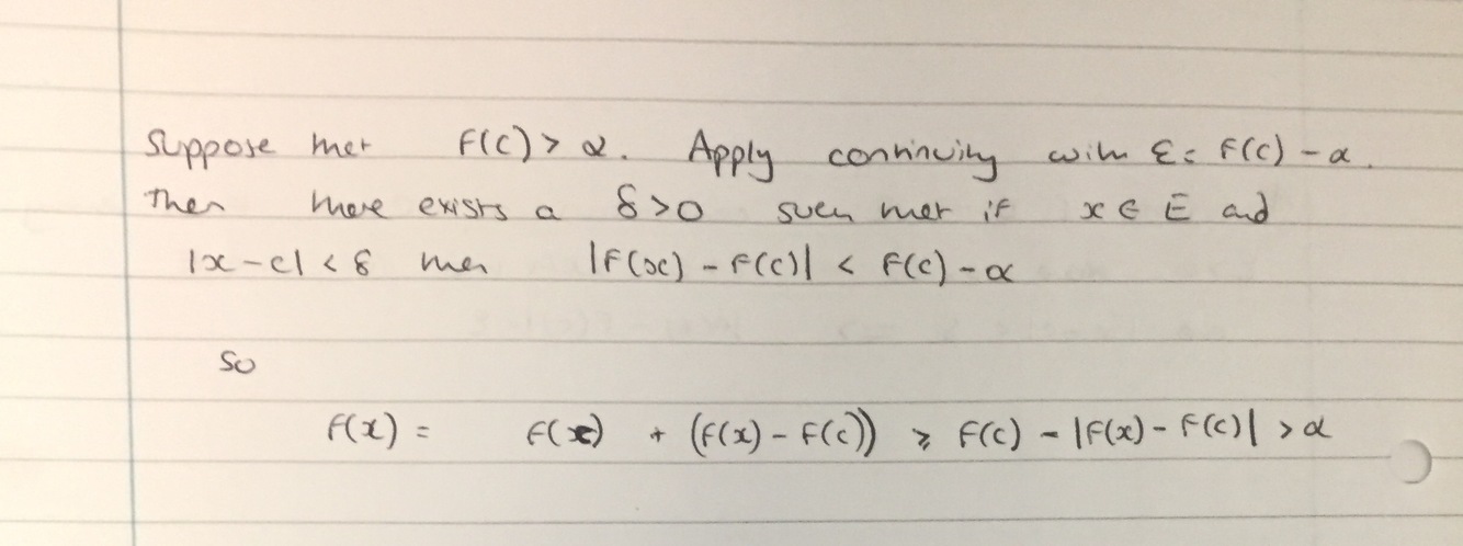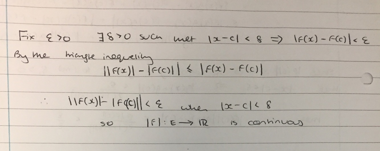 Lemma; Suppose that f,g: E to R are continuous at c in E. The the function |f| is continuous