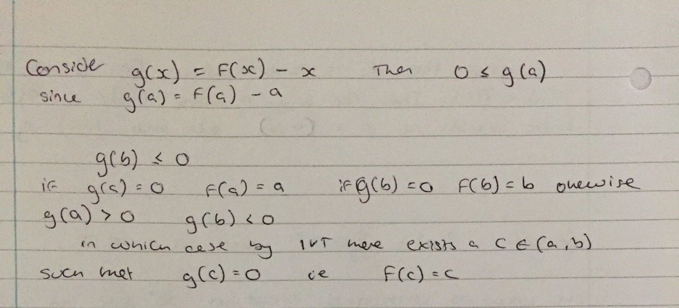 Lemma; Any continuous function f: [a,b] to [a,b] has a fixed point ie there is an x* in [a,b] such that f(x*) = x*