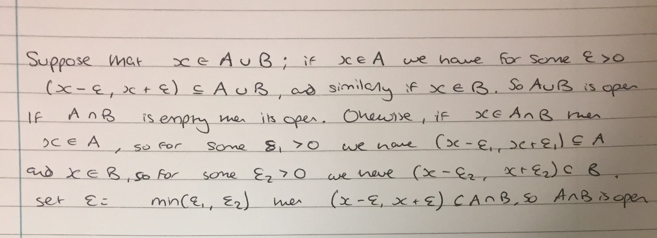 Lemma; Suppose that A and B are open subsets. Then A u B and A n B are open